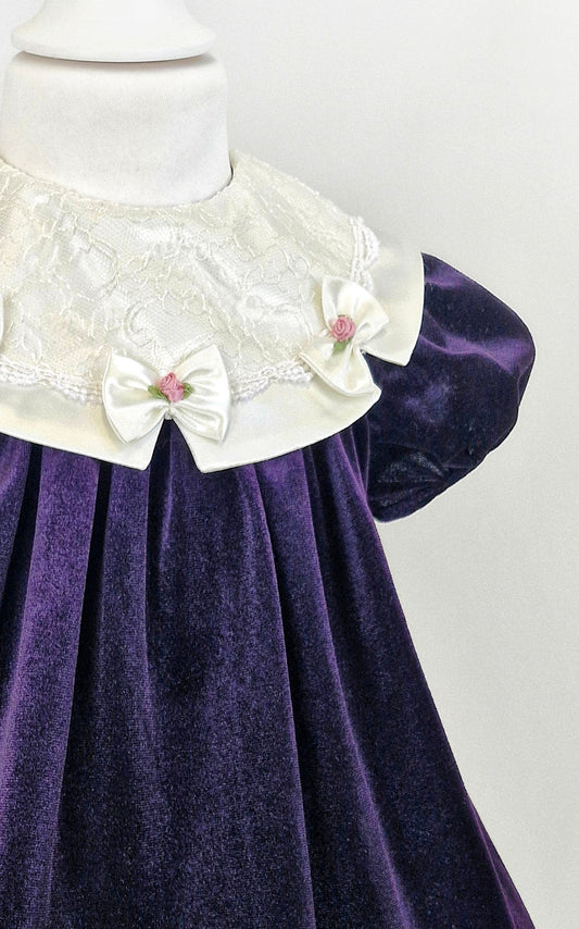2-3 years. Deep purple velour vintage dress with cream satin/lace bib, bows and pink roses by Bonnie Jean