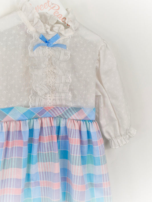 2-3 years. White New York Kids dress with pastel checked skirt and blue bow