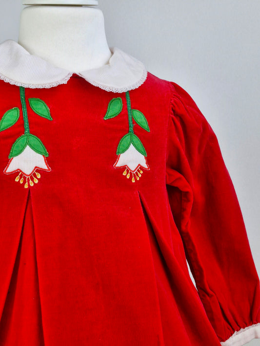 2-3 years. Red velour dress with white Peter Pan collar and embroidered flowers