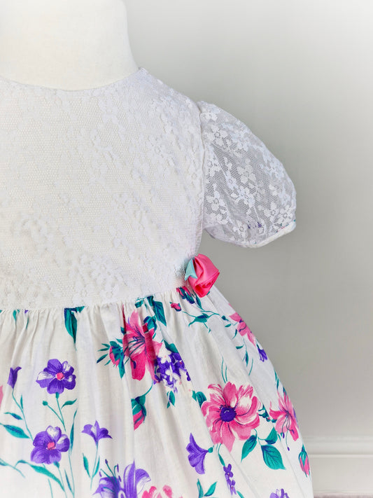 3 years. Lemon dress with white lace and bow on bib. Lace hem.