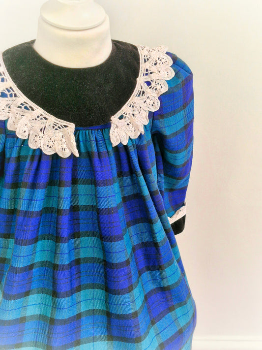 3 years. Blue, green and black tartan Emily Rose dress with crocheted details from 1961