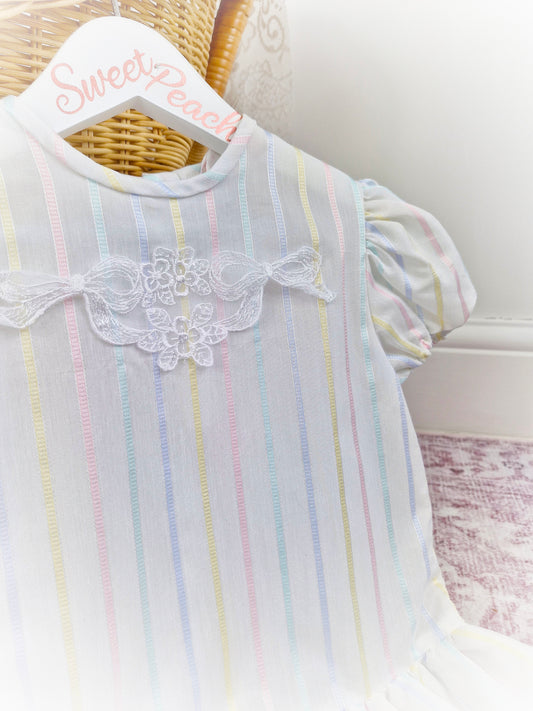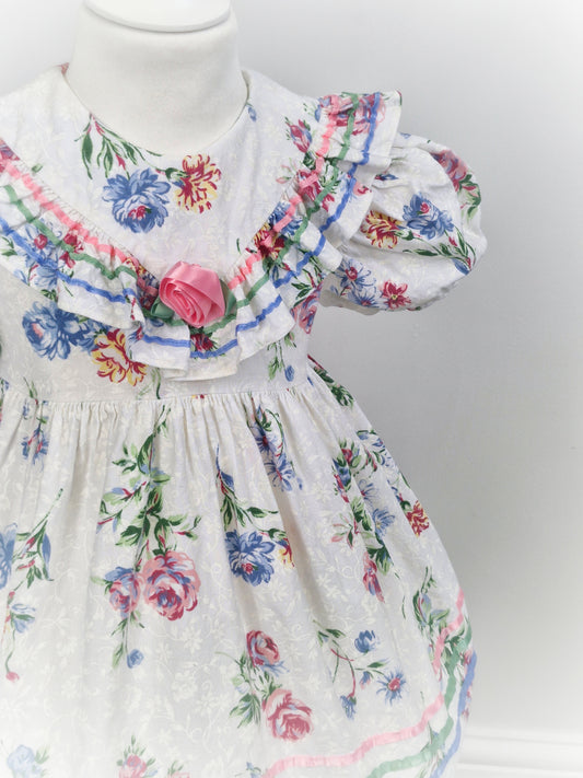 3 years. White dress with floral print, ribbon and rose on ruffled bib