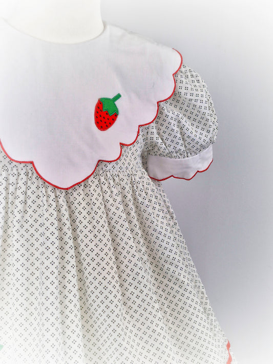 4 years. Vintage strawberry dress, off-white with dot patterns, white scalloped bib and sleeves with red trim