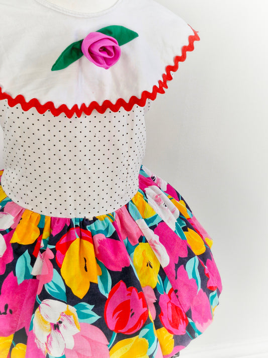 3-4 years. 80s dress, white with polka dot, floral skirt, large bib with rose. Black lace hem.