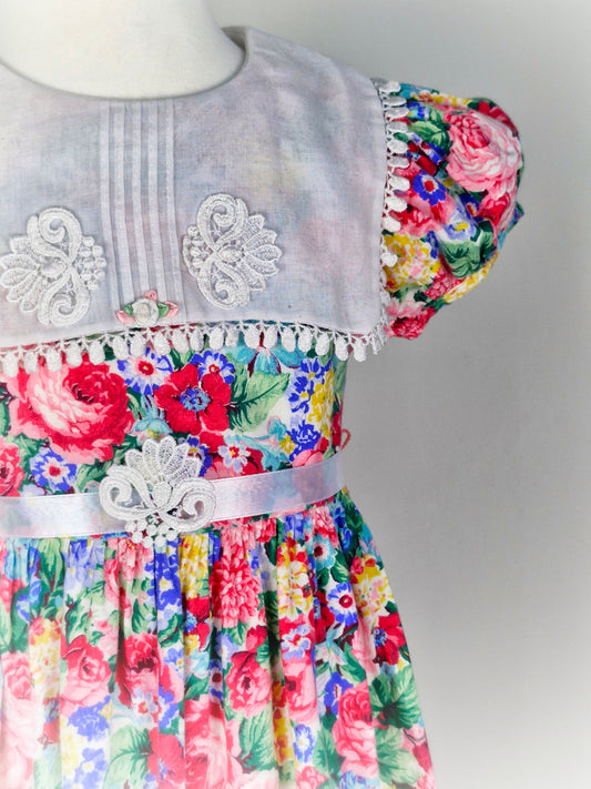 6-7 years. Beautiful floral vintage dress by Picture Perfect with lace bib and hem