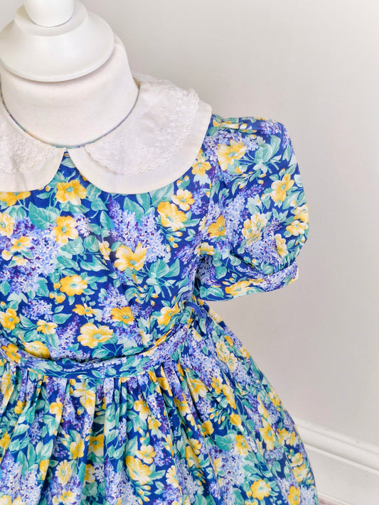 5 years. Blue and yellow Laura Ashley dress with white embroidered double collar