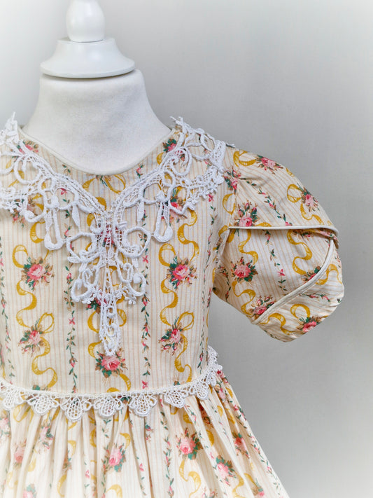 6 years. Handmade, victorian style, puff sleeves, lace trim neckline. Striped dress with floral bouquets