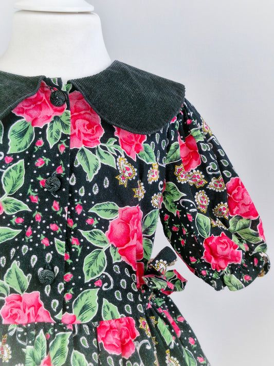 5-6 years. Black dress with pink roses, paisley patterns and a corduroy collar.