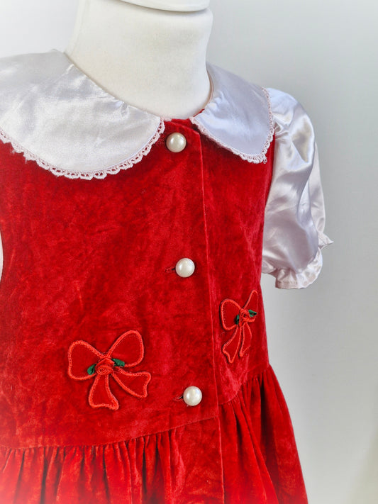 6 years. Red velvet dress with while silk collar and sleeves. Bow/Rose details, pearl buttons