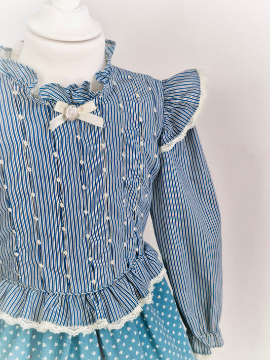 5 years. Blue and white striped vintage Mimix dress, long sleeve with white bib and red ribbon details