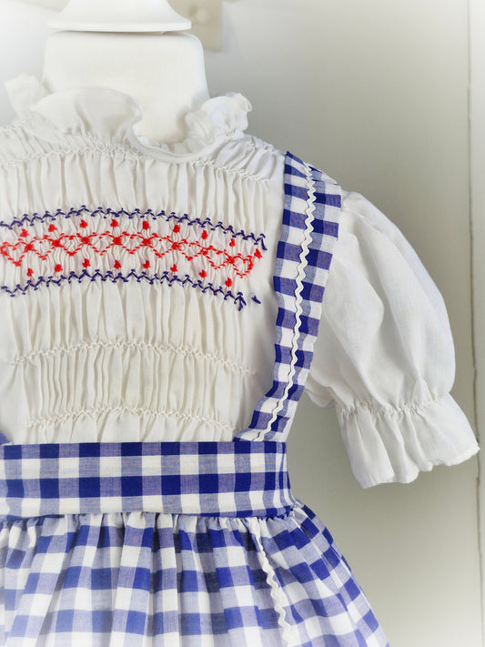 7 years. Navy and white Sweet Angela gingham smock dress with teddies