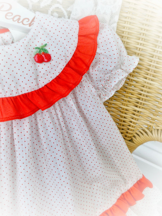 9-12 months. White with red polka dot vintage dress from Kiddie Korner, red frills and cherry applique