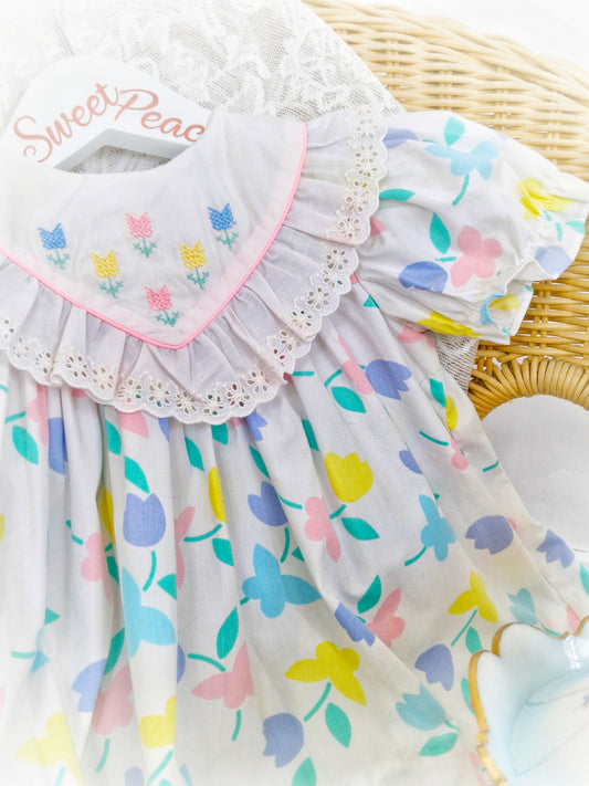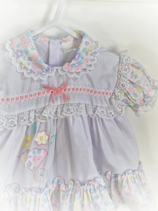 9-12 months. White frilly vintage dress with pastel flowers, ribbon and lace