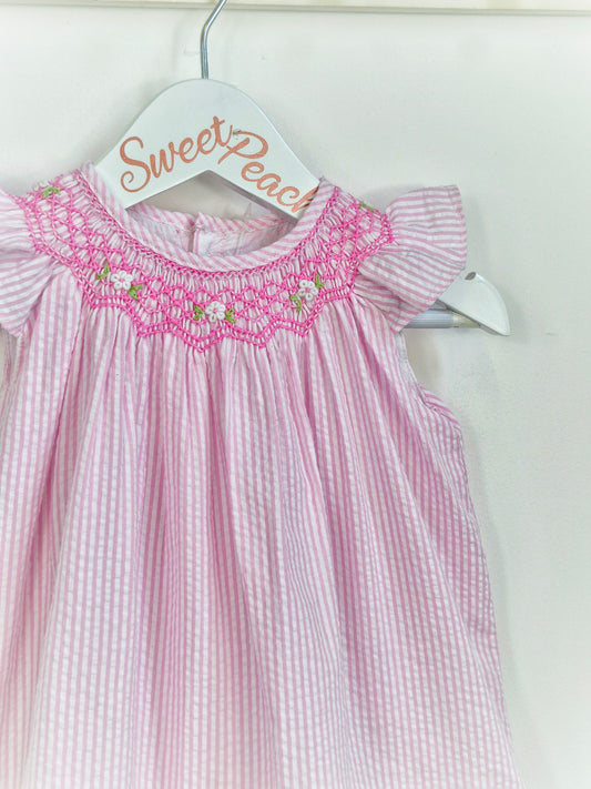 9-12 months. Vintage inspired pink and white striped dress with pink smock collar and flutter sleeves