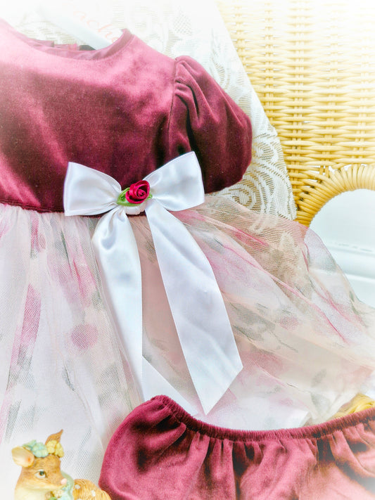 9-12/12-18 months. Two piece set, crimson velour, floral. With bloomers