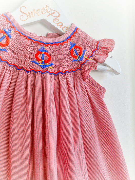 9-12 months. Vintage inspired, red and white striped dress with flutter sleeves, smocking and embroidered anchors
