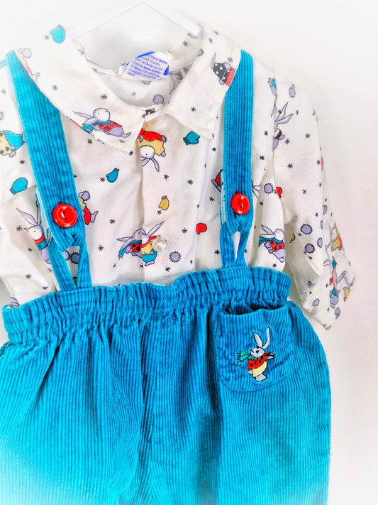 12-18 months. Two-piece set. Teal corduroy dungarees with embroidered bunny, matching bunnies on shirt, winter themed