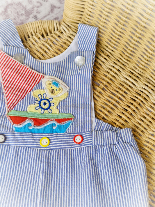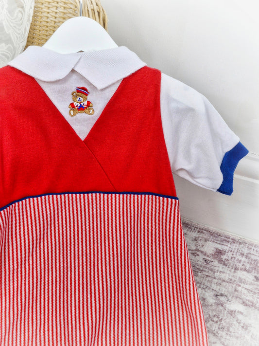 6-12 months. Red and white romper with navy details. Embroidered sailor bear