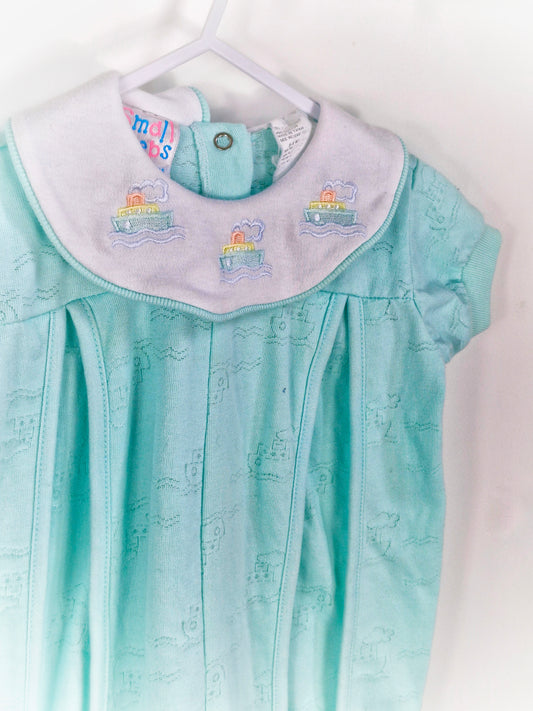 6-9 months. Mint romper with embroidered boats on collar. Small steps