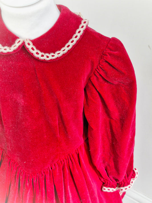 5 years. Deep red velvet handmade drop waist with dainty lace details