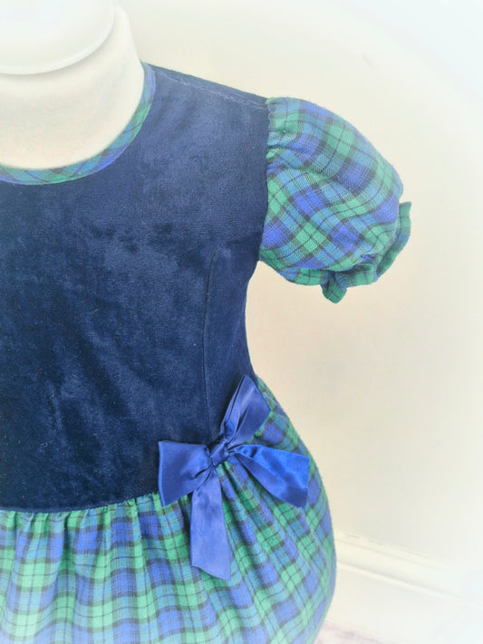 2 years. Vintage Adams dress, navy velour top and tartan skirt and sleeves with blue ribbon bow.