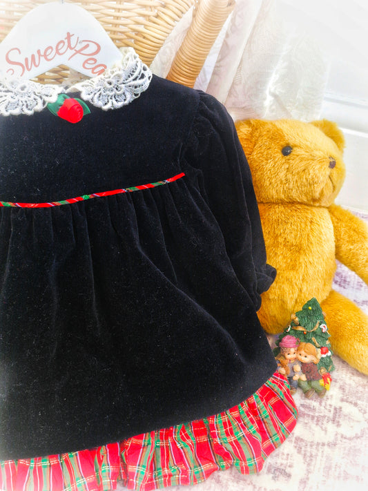 18-24 months. Black velvet Bryan with tartan trim and lace collar.