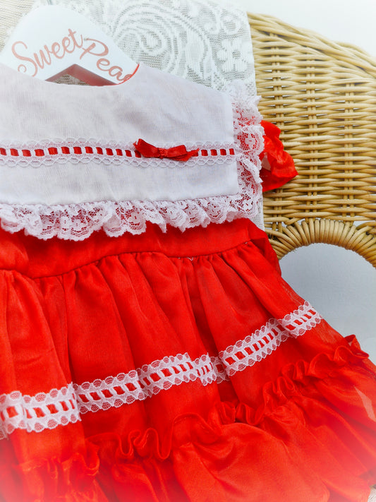 6-9 months. Red Kandy Ann dress with white bib and lace, red ribbon.