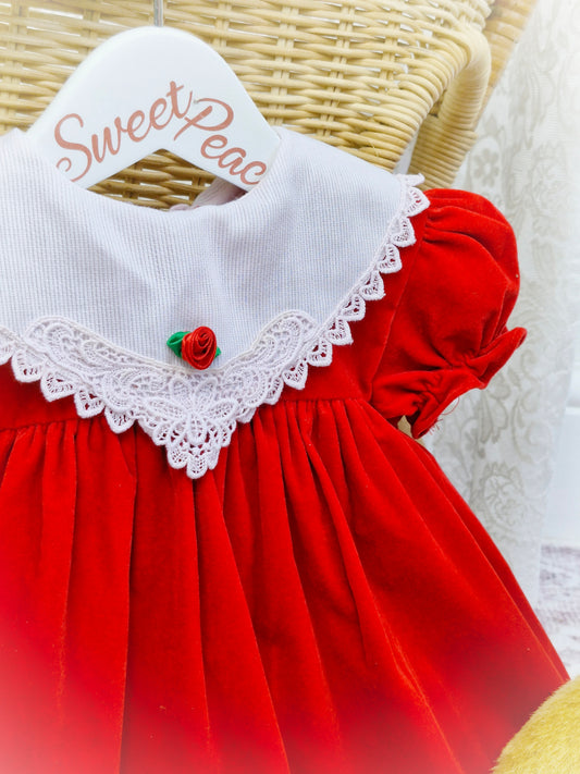 12-18 months. Red velvet dress with white bib and lace and a rosette. Hugs & Kisses