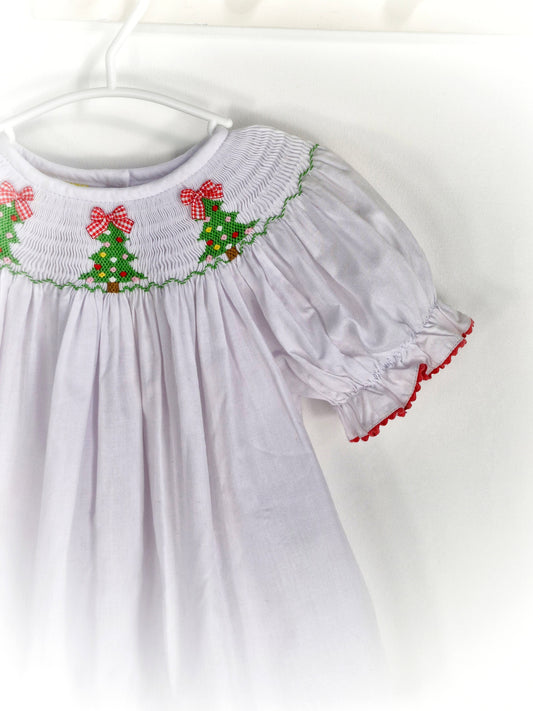 18 months. White smock dress white embroidered Christmas trees and red and white gingham bows