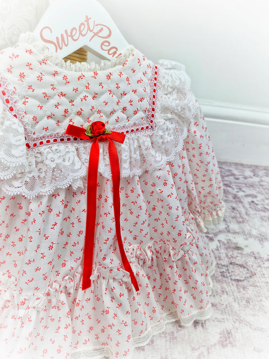 9-12 months. Red vintage Bryan with festive floral print, white Cuddle bib and red rosette