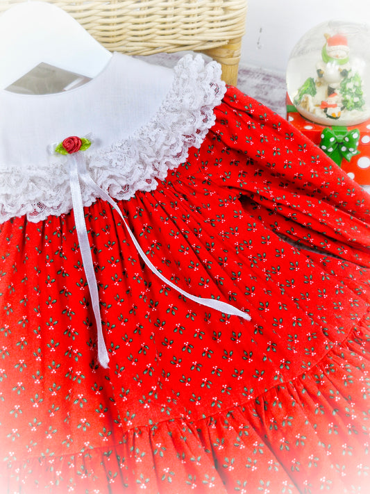 2 years. Red button down vintage inspired dress with long sleeves and white collar embroidered with holly leaves and berries