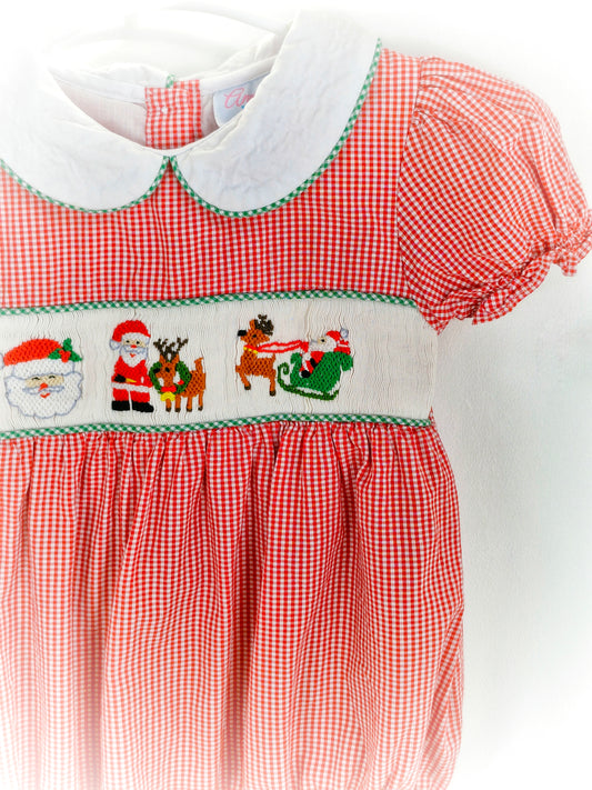 12-18 months. Red and white gingham smocked romper with embroidered santas, white Peter Pan collar and puff sleeves