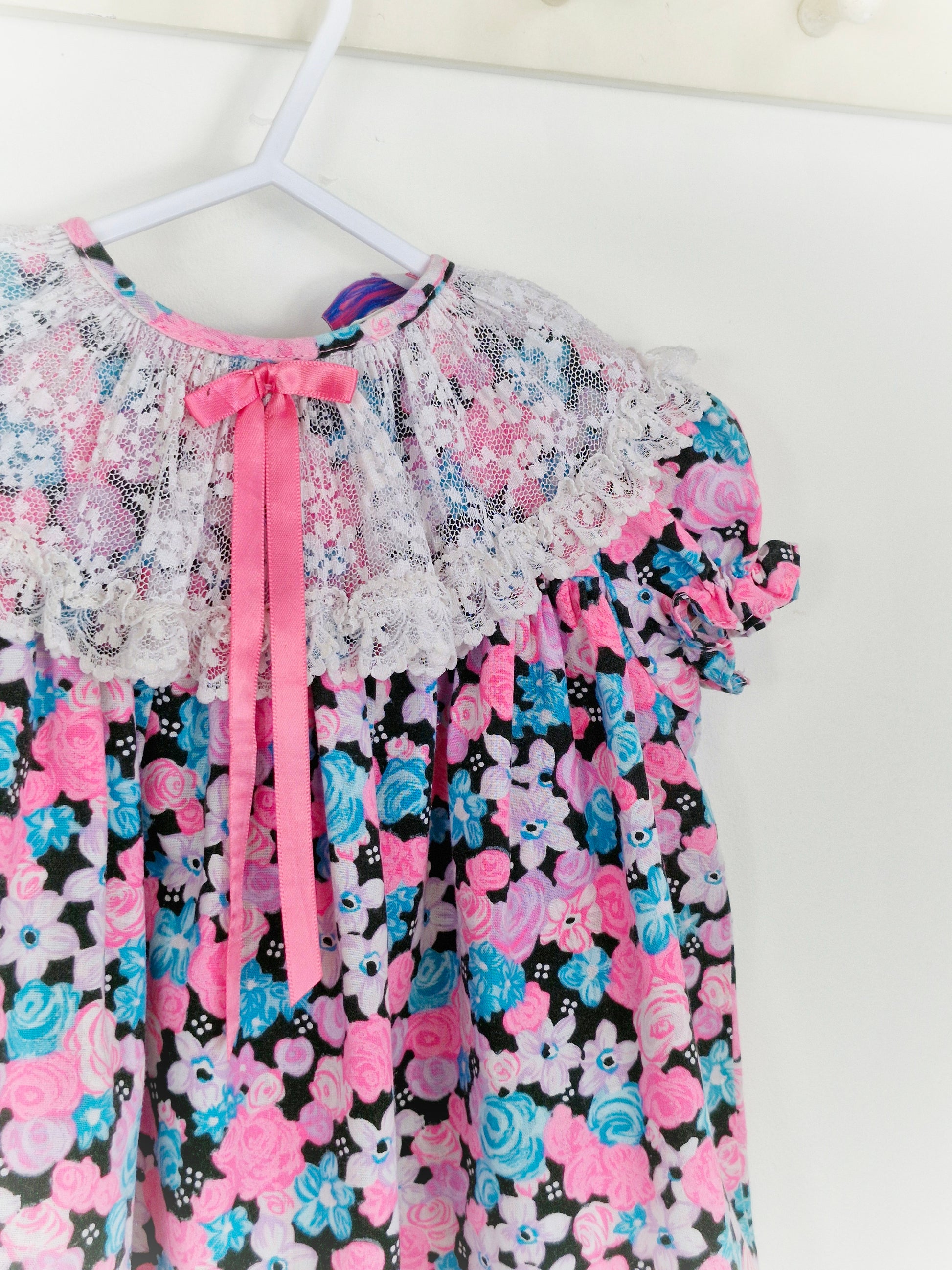 12-18 months. Bright, floral Roanna dress with lace bib and pink ribbon