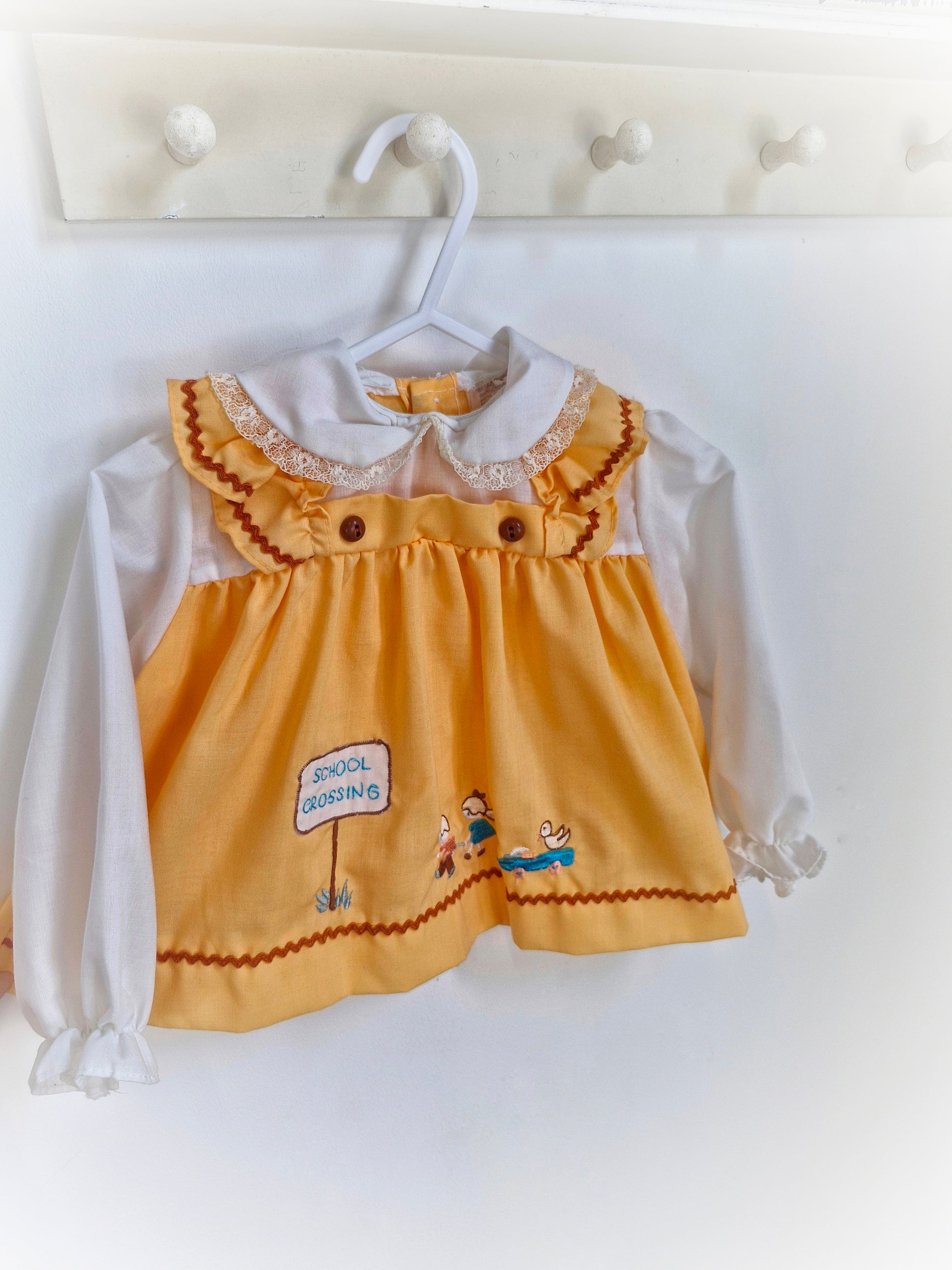 12-18 months. Peach coloured blouse with with sleeves and embroidered "school crossing"