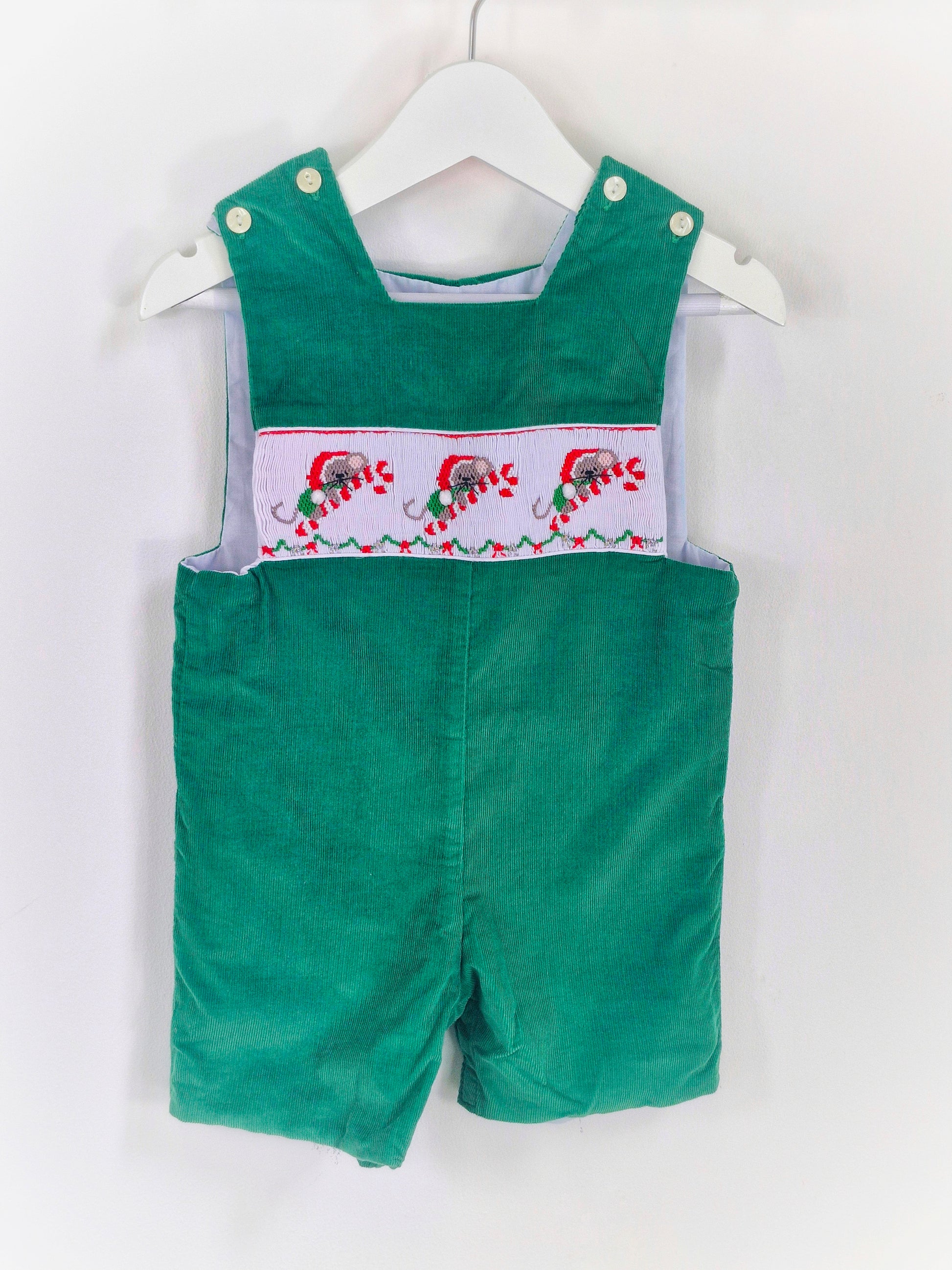 12 months. Green corduroy romper with smocking and embroidered mice with Christmas hats & candy canes