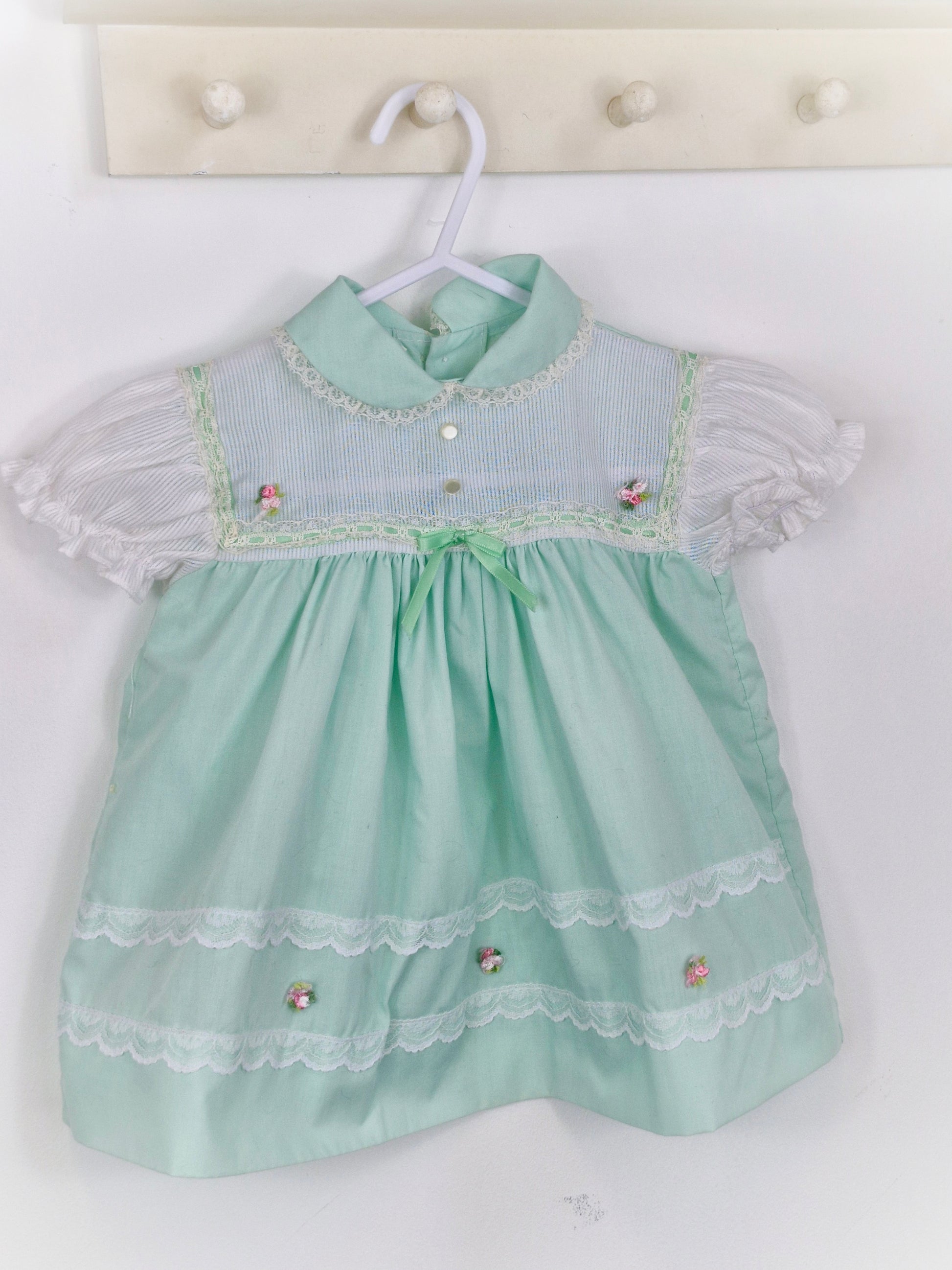 12 months. Mint and white Cradle Togs with rosette, lace and ribbon details