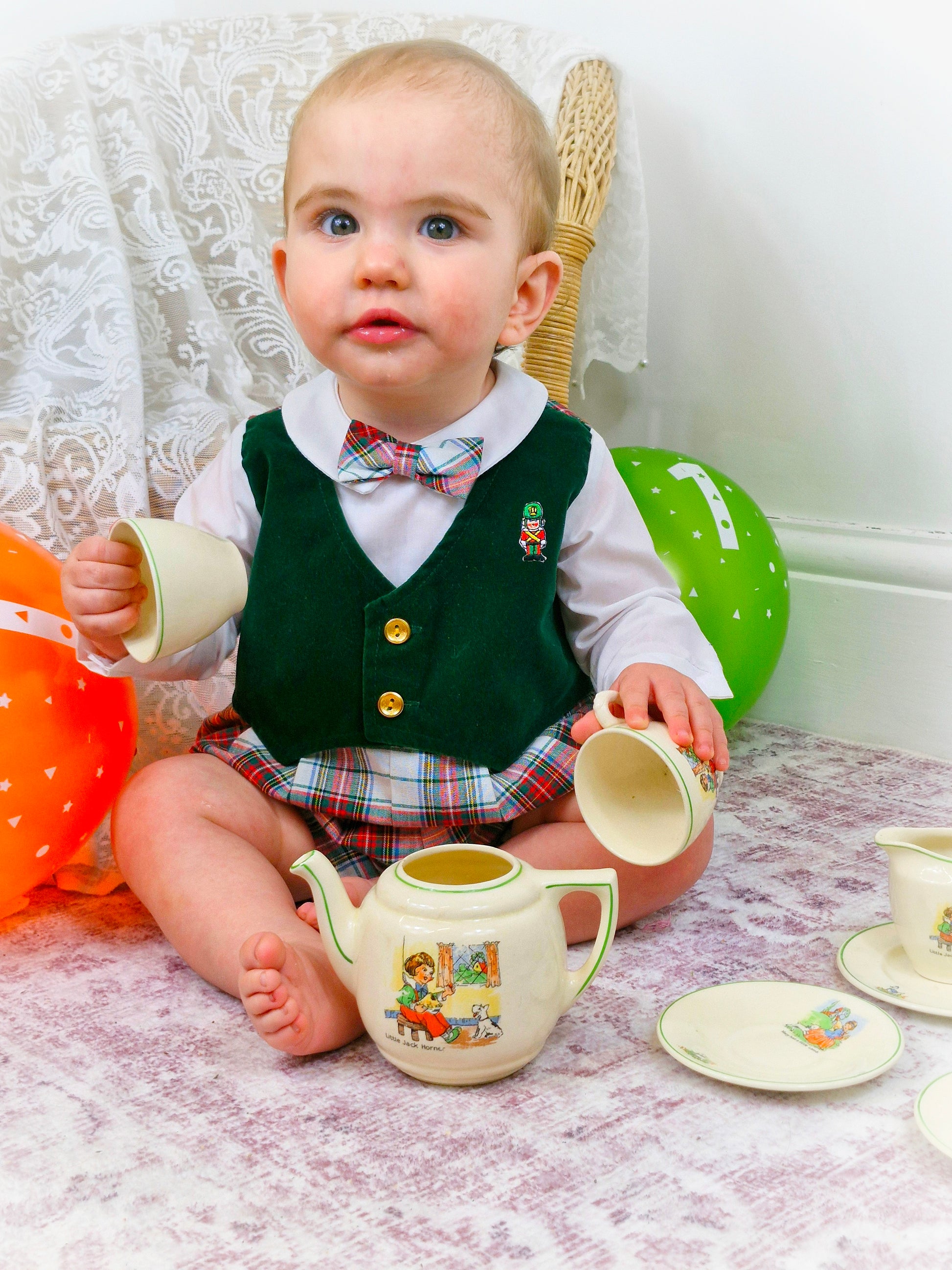 12 months. Vintage romper by Great Guy. Long sleeves, green velvet-like vest, tartan bottom and bow tie. Embroidered toy soldier and gold buttons