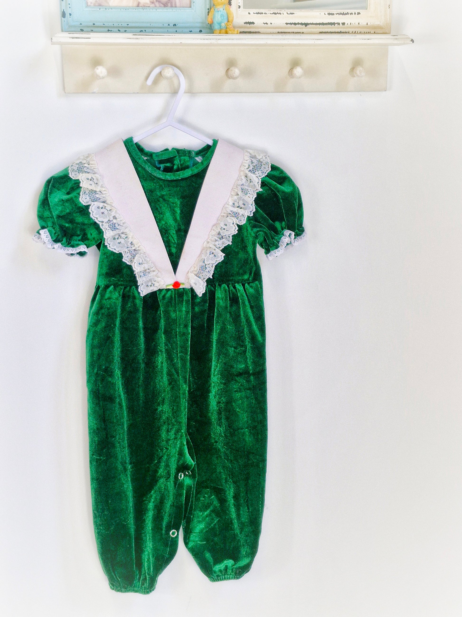 18-24 months. Green velvet vintage romper from Violet Rose & Co. White frilly details
