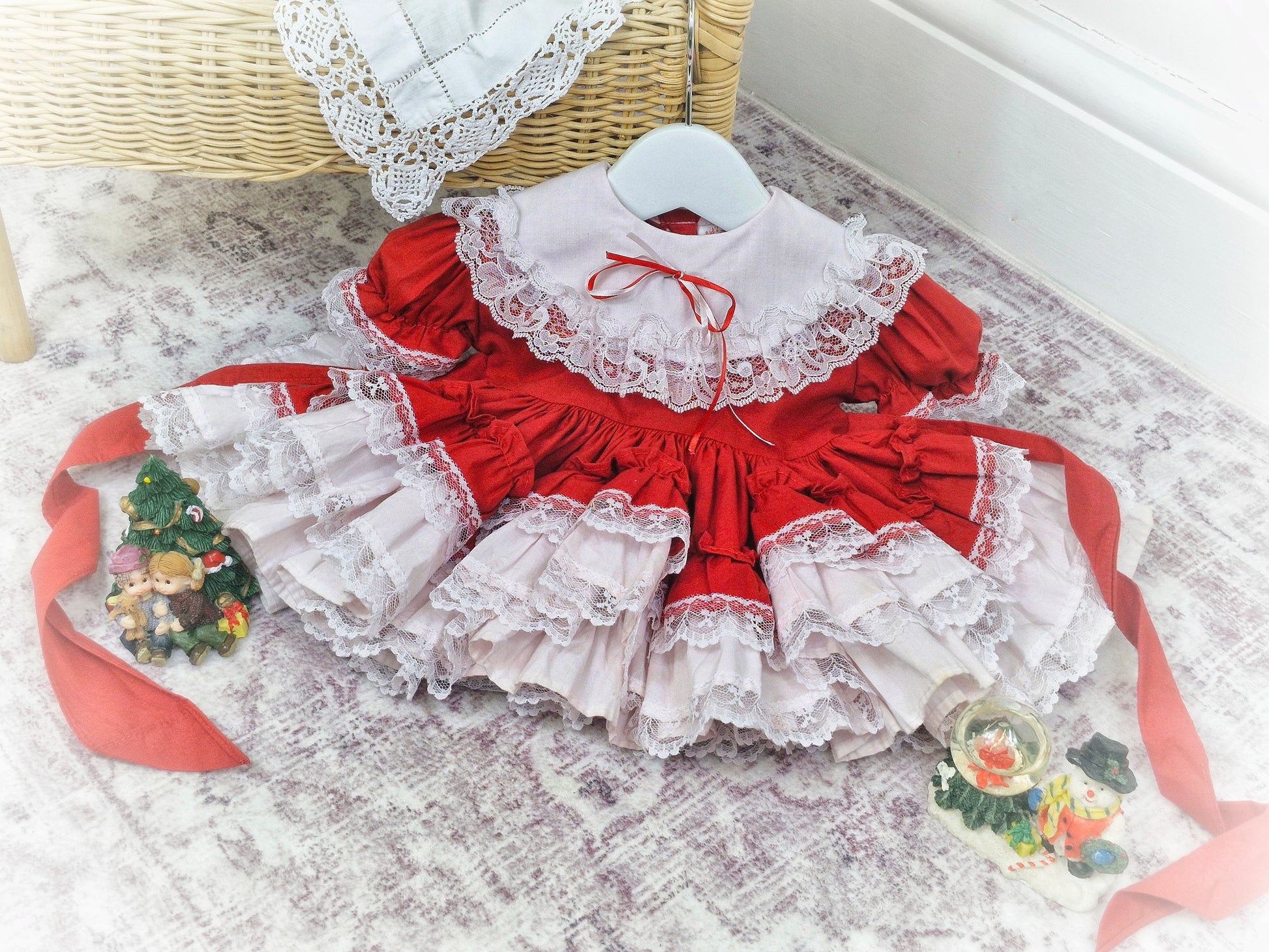 6-12 months. Red Lid'l Dolly with white bib and lace ruffles