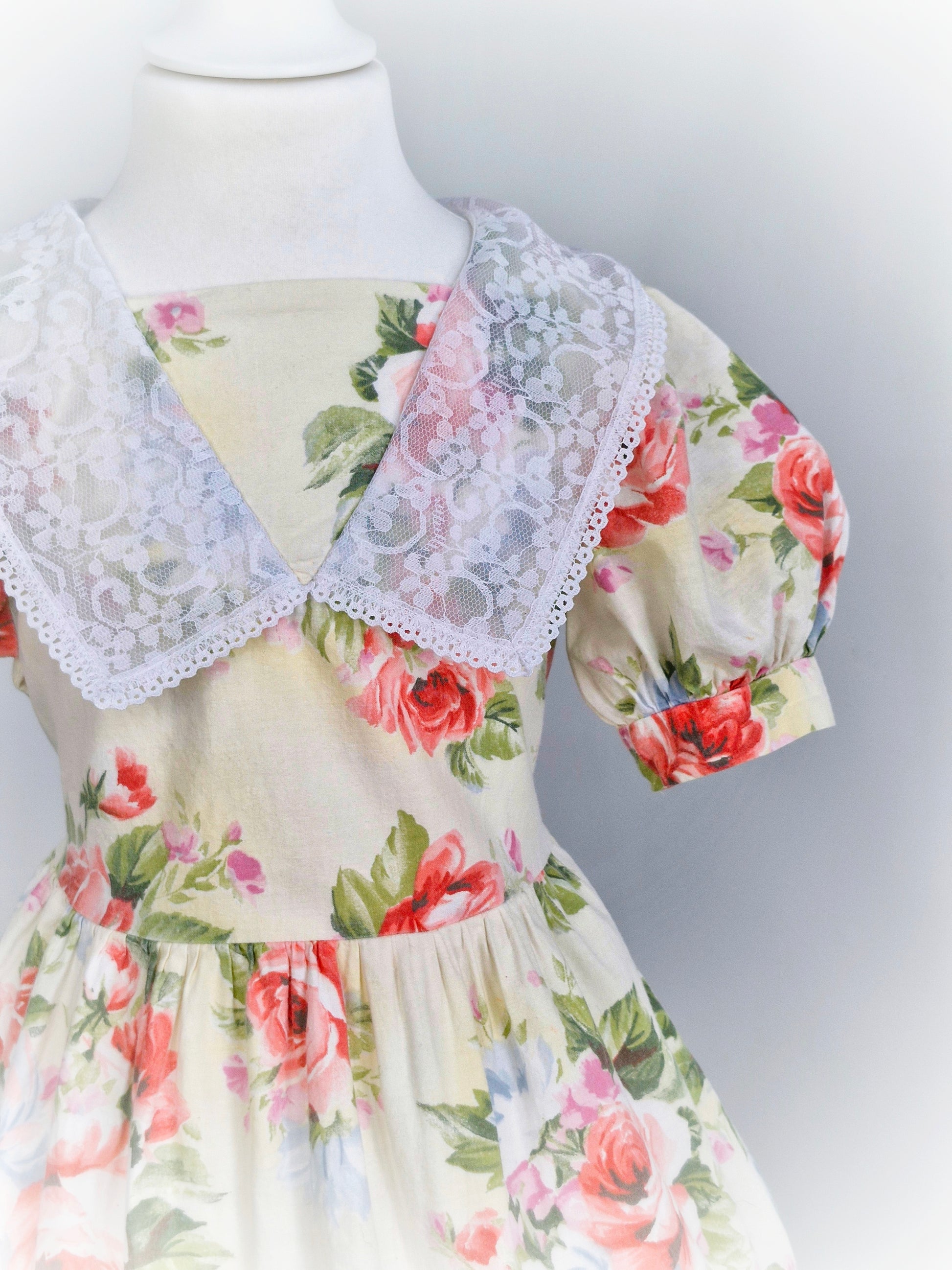 Cream floral vintage dress by Sugar Plum, puff sleeves and white lace bib