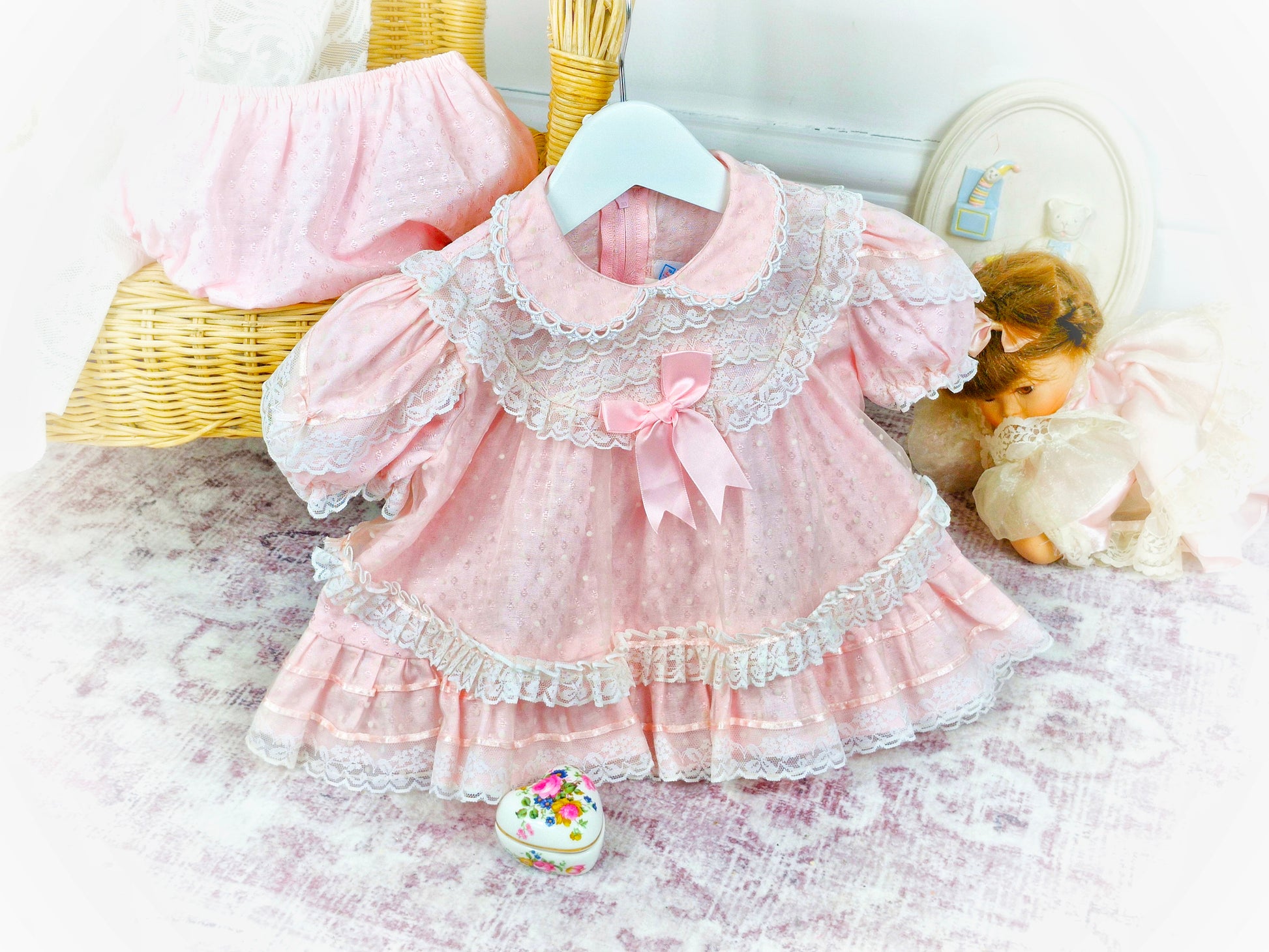 6-12 months. 2 piece vintage set by La Gloire, pink with white lace and satin bow. Comes with bloomers