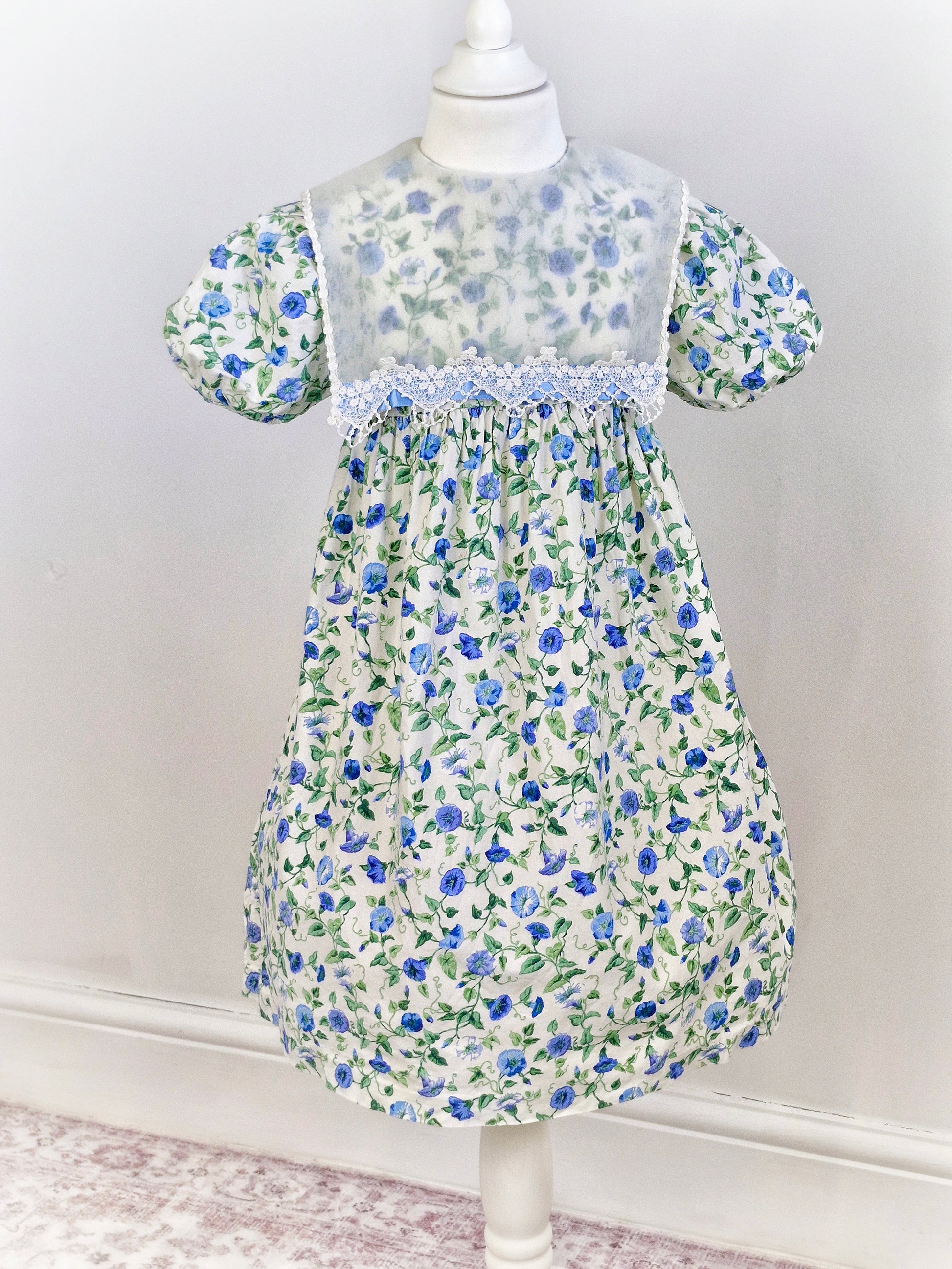 6 years. Allison Ann vintage dress, cream with blue flower print and sheer white bib