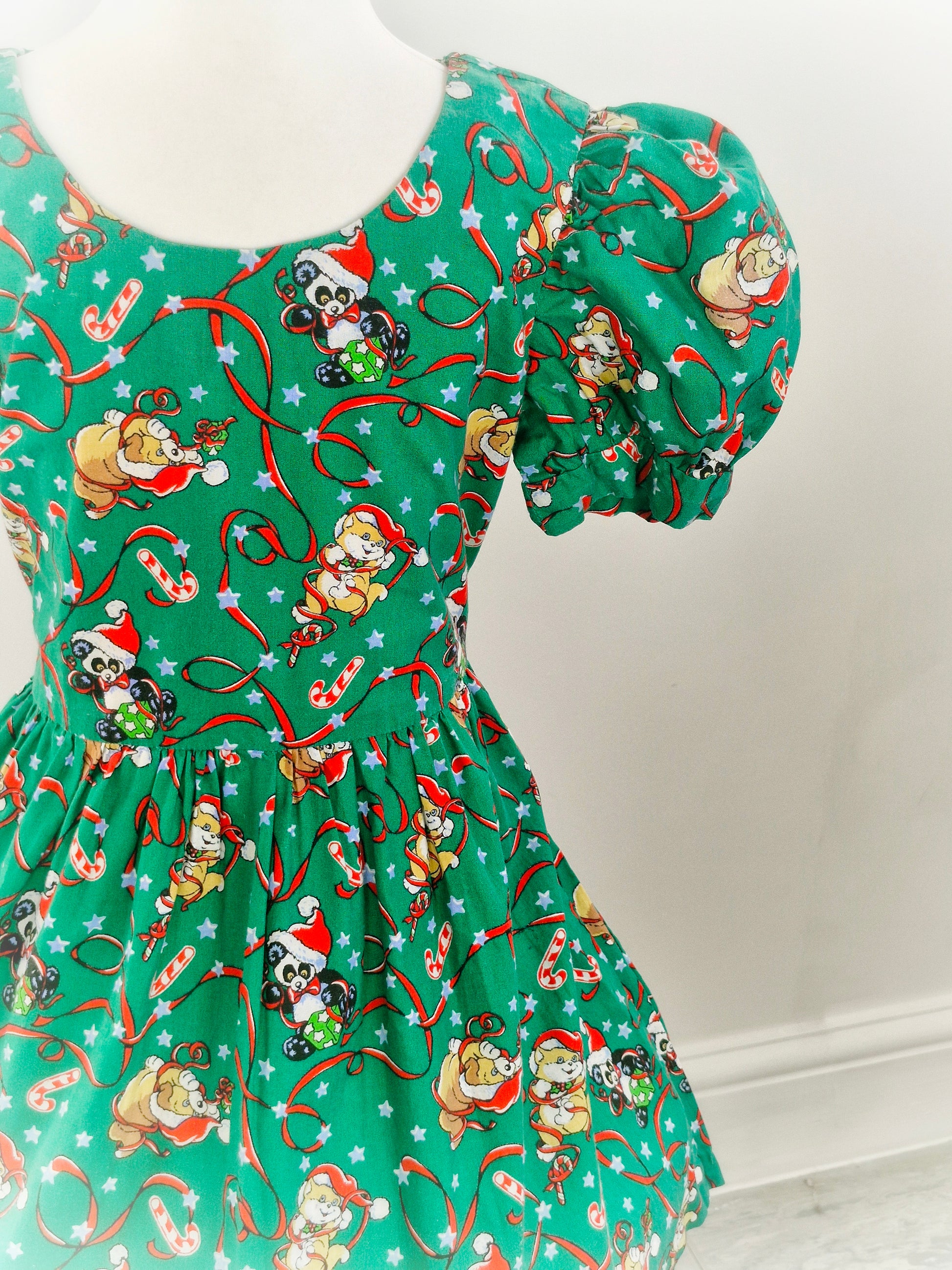 Green handmade vintage festive dress with puffed sleeves and christmas animal print