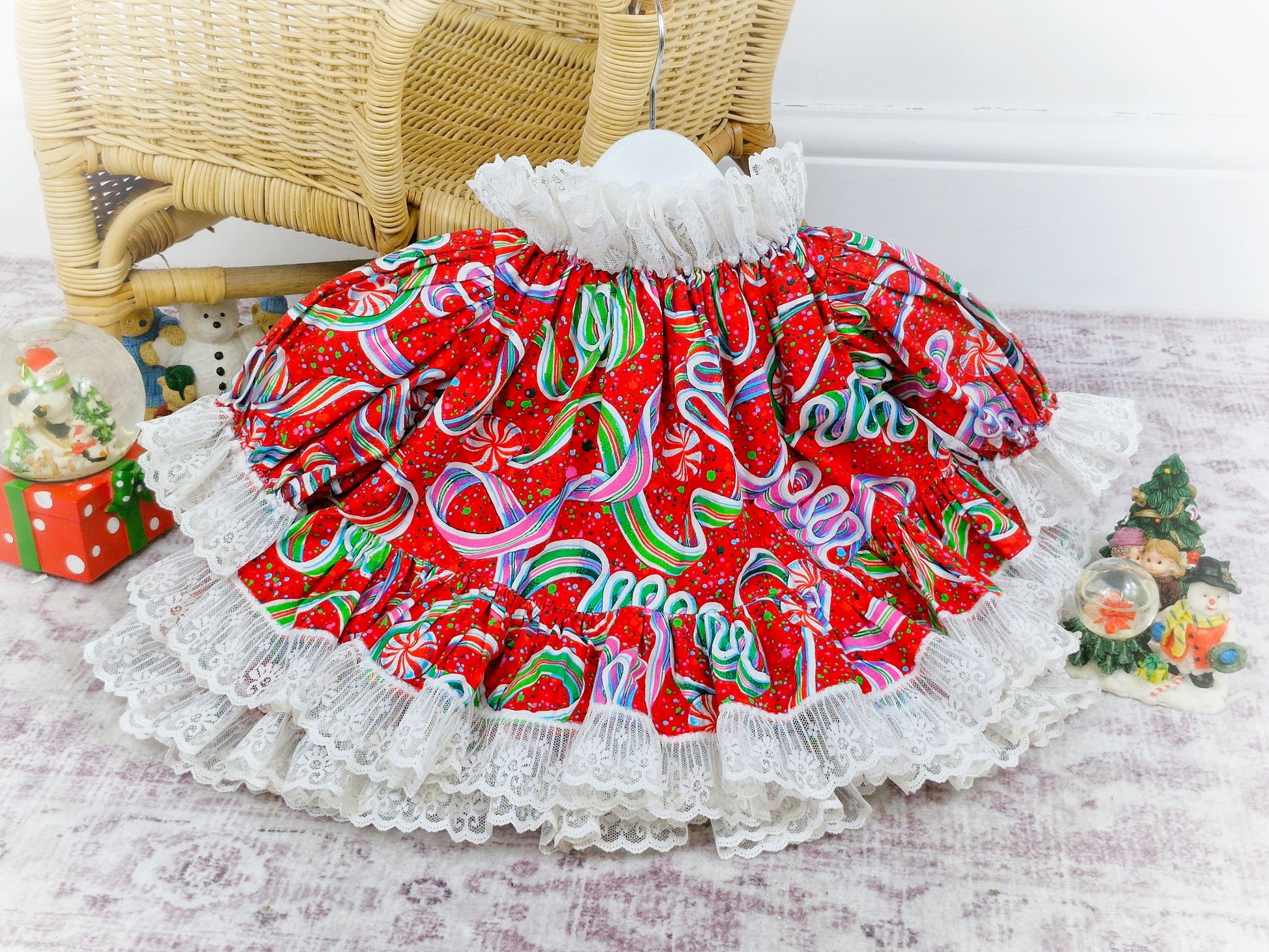 9-12 months. Brightly coloured handmade festive dress with puffed sleeves and a white lace trim