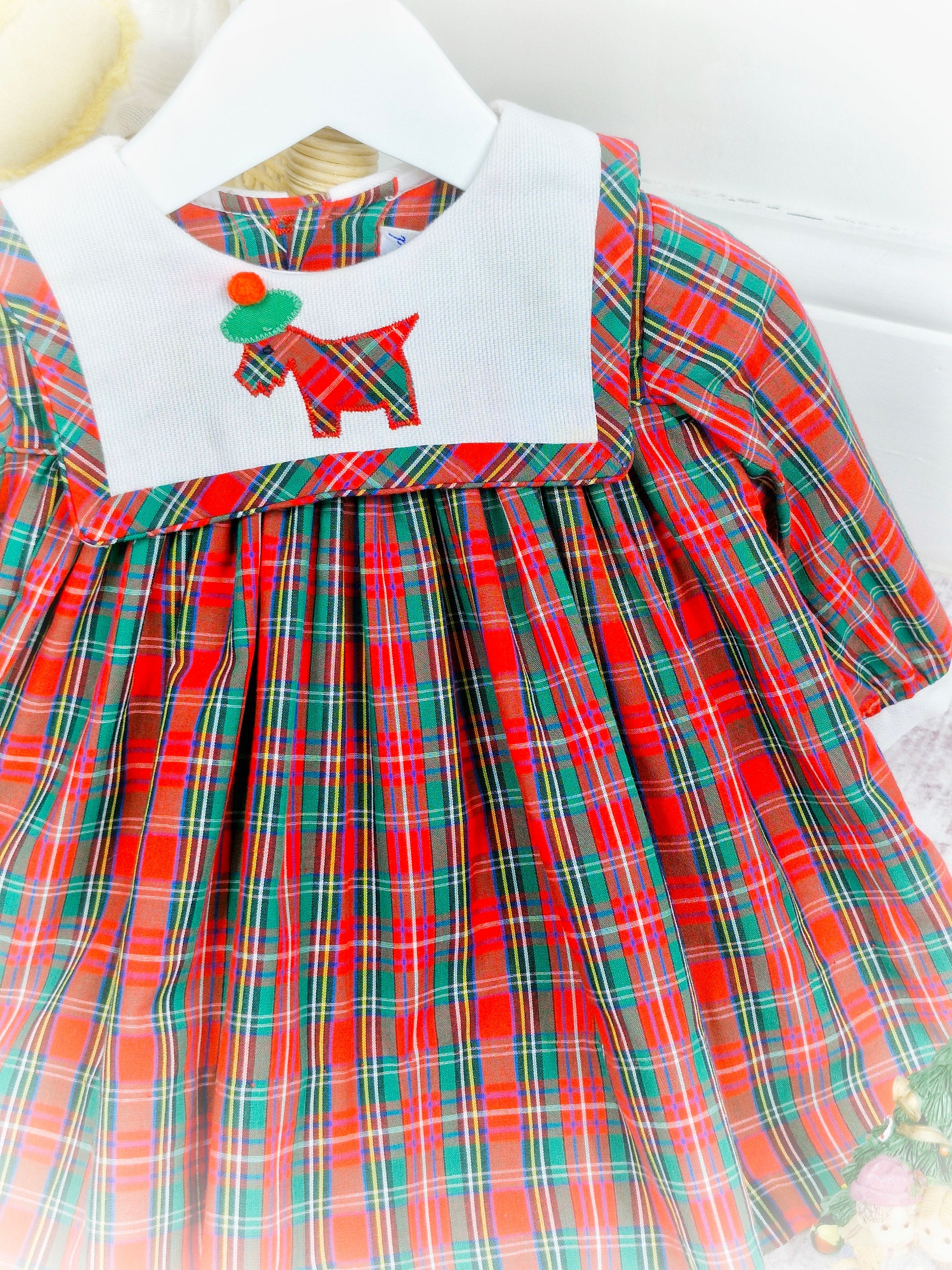 9-12 months. Vintage Jayne Copeland. Tartan dress with white bib and scottie dog