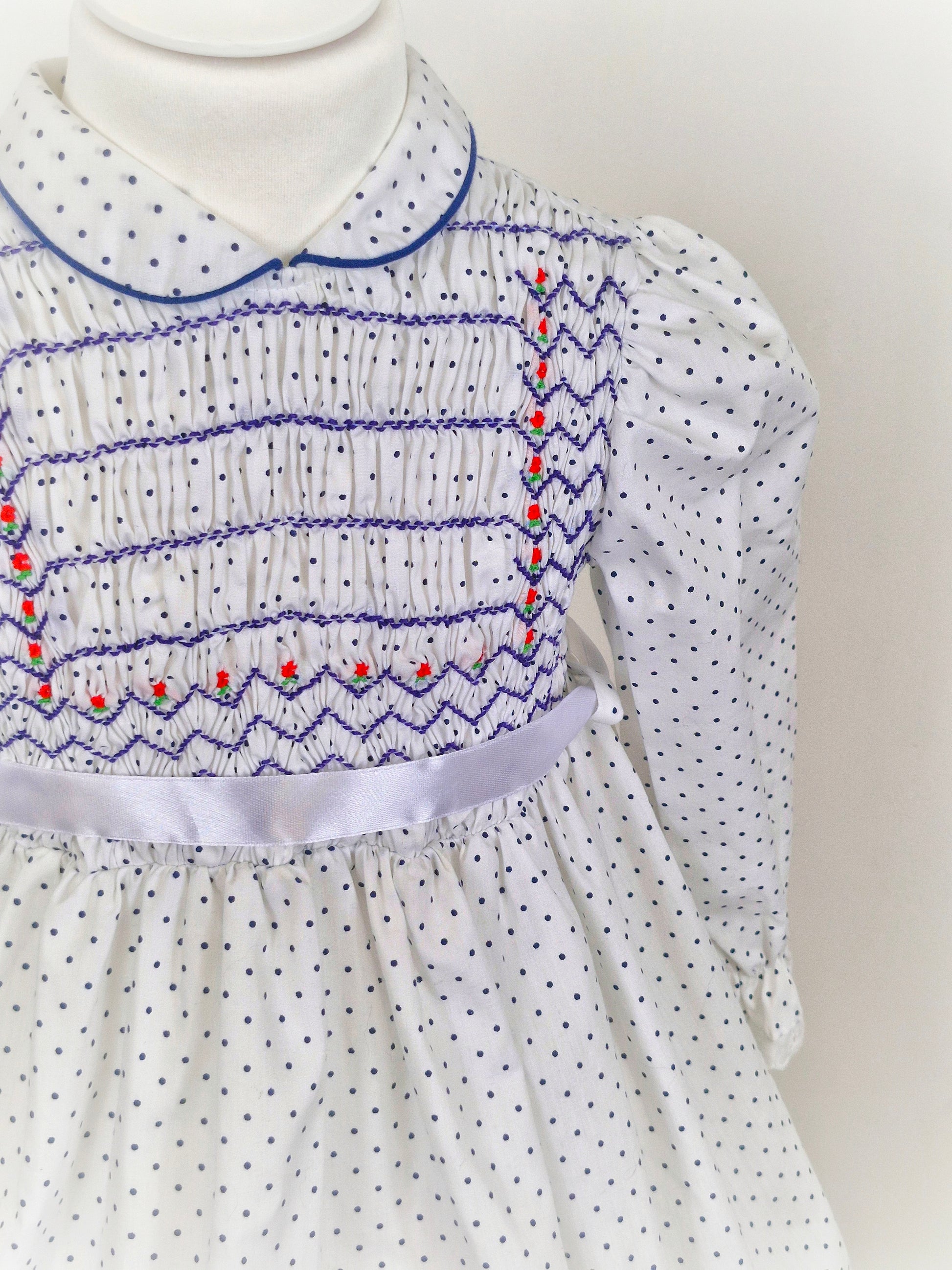 White Polly Flinders smocked dress with navy polka dots and embroidery