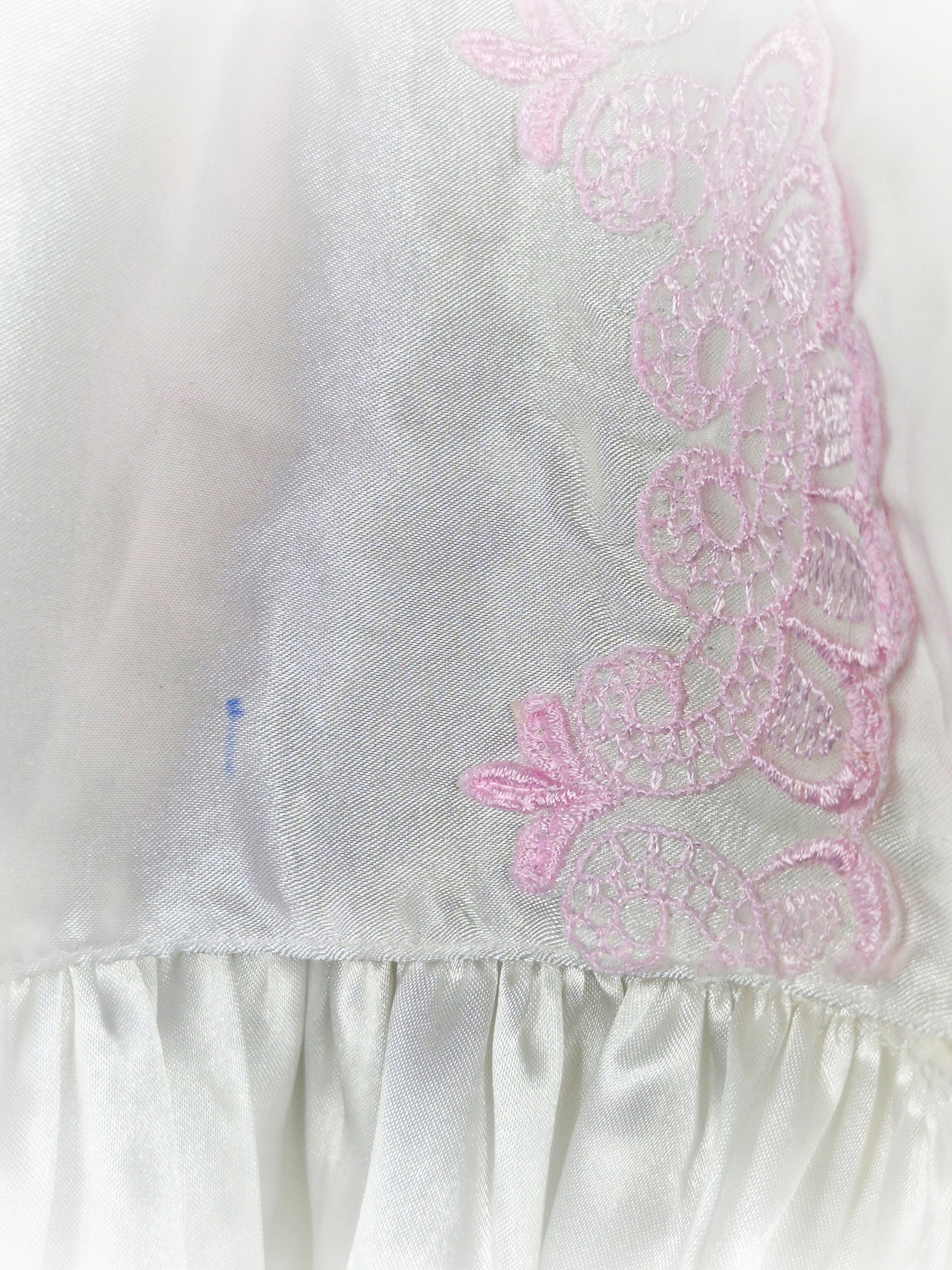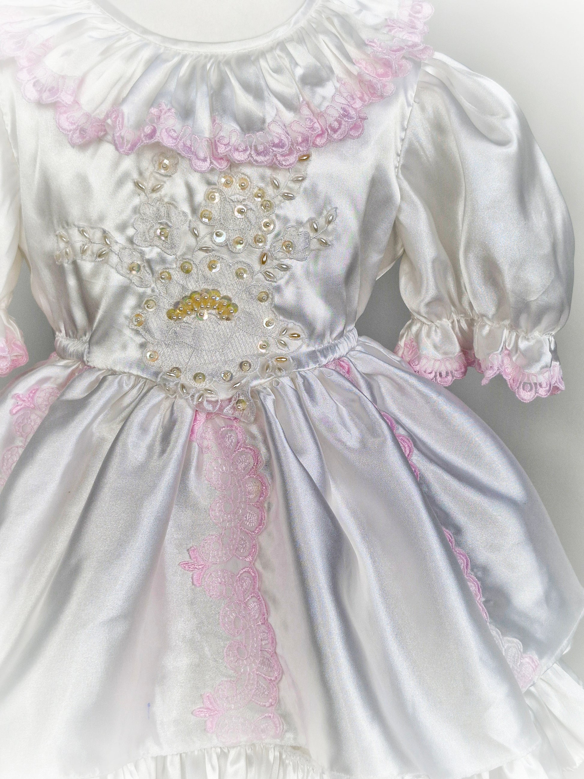 3 years. White satin vintage layered dress with pink lace and puff sleeves.