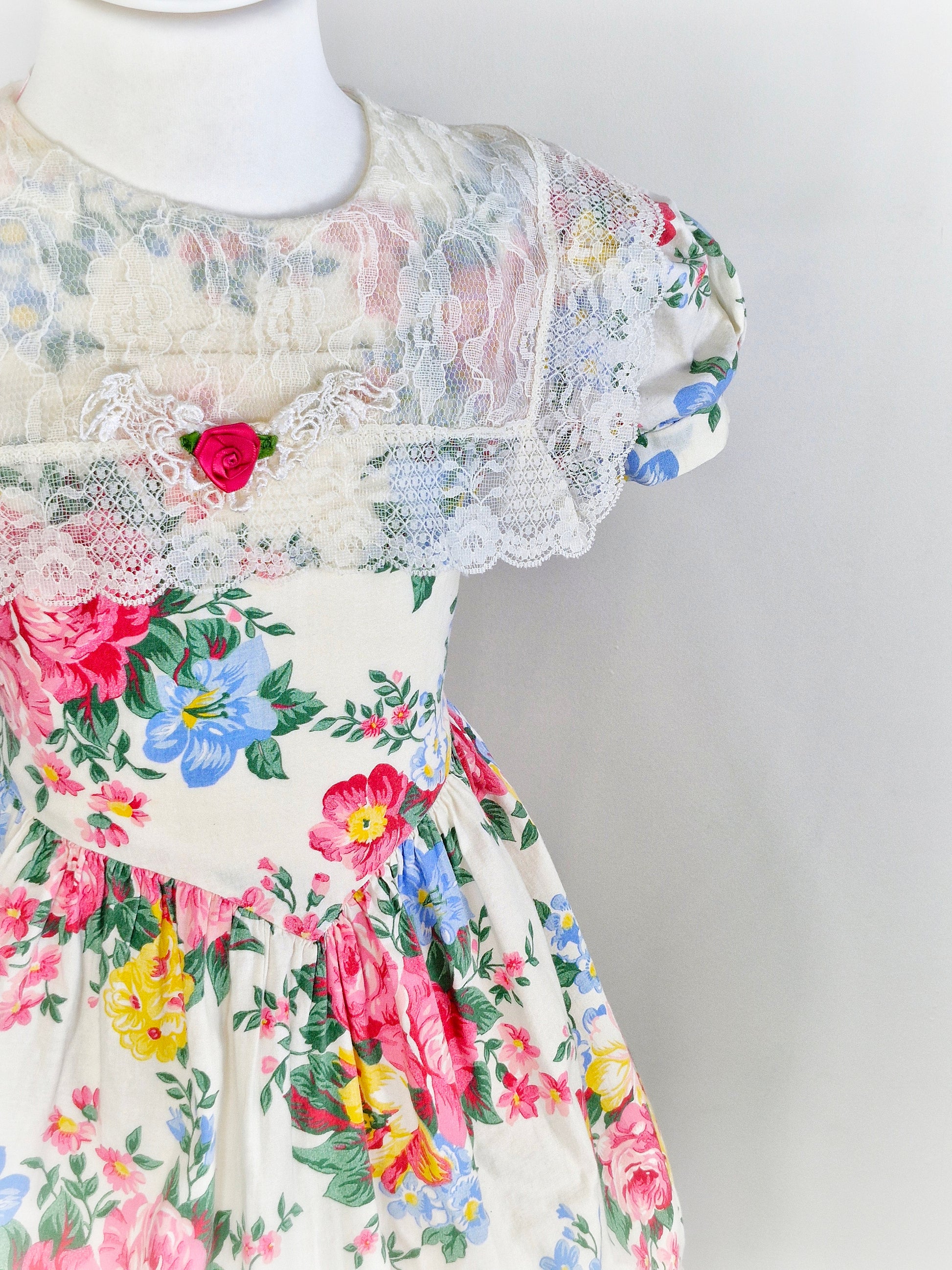 6-7 years. Beautiful floral vintage dress by Picture Perfect with lace bib and hem