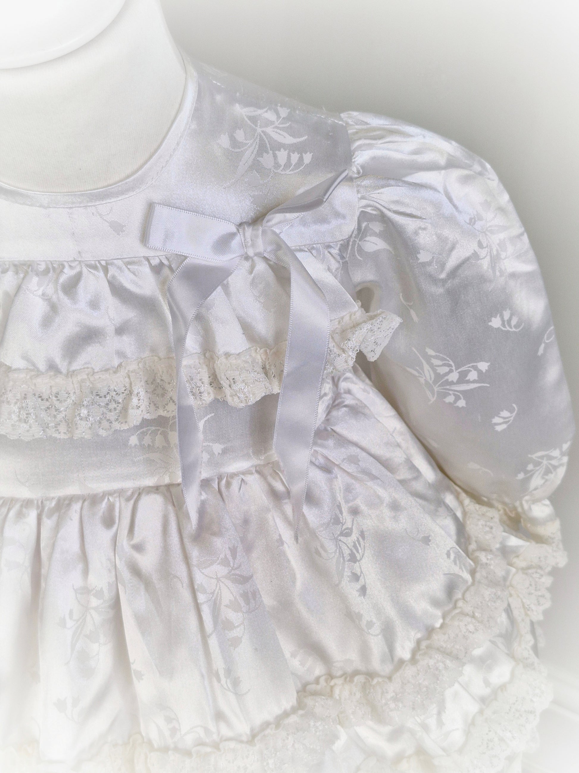 12-18 months. White satin dress with puffed sleeves, ribbon and lace