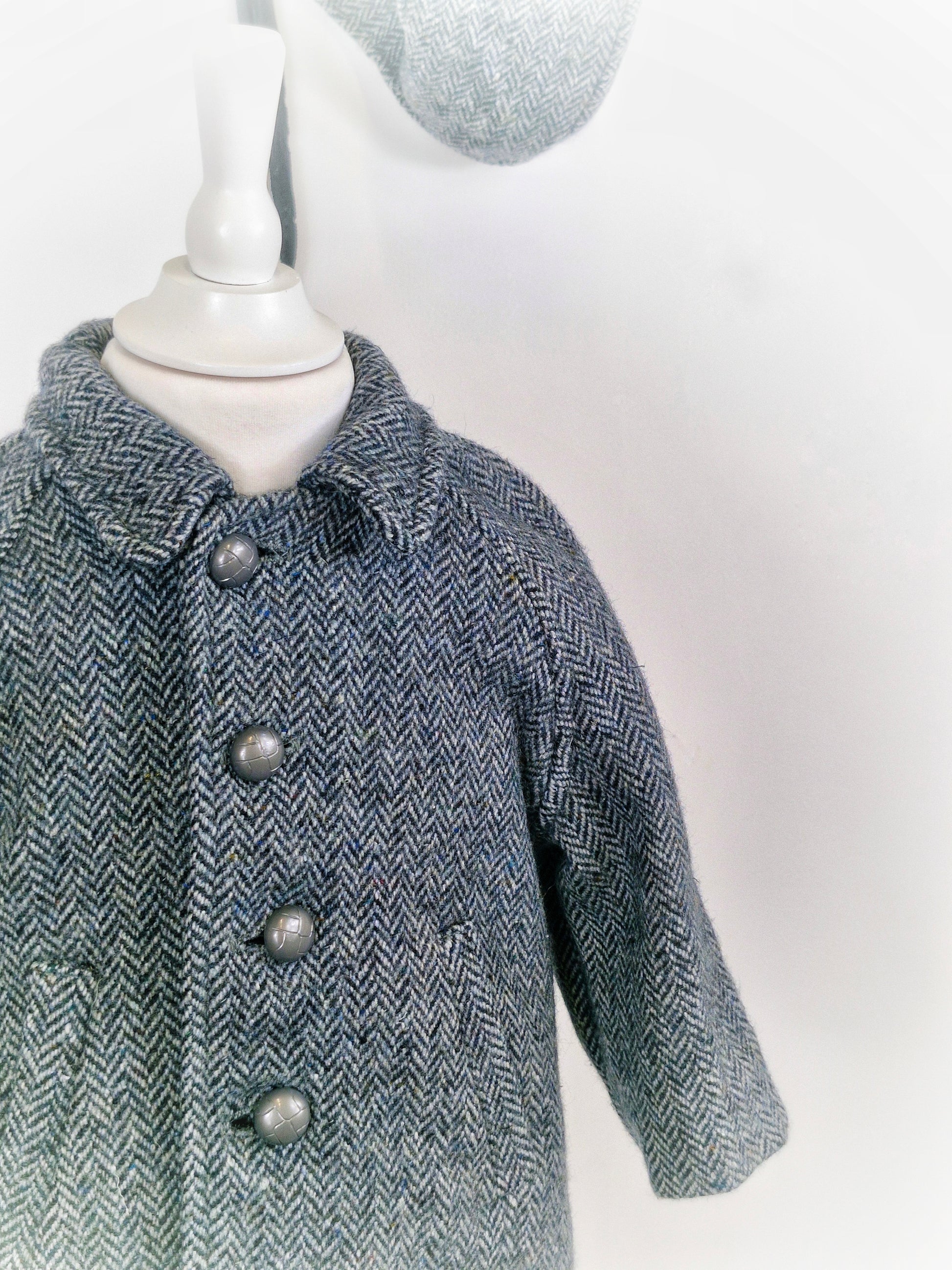 18-24 months. Grey vintage herringbone wool coat with collar and silver buttons and matching hat.